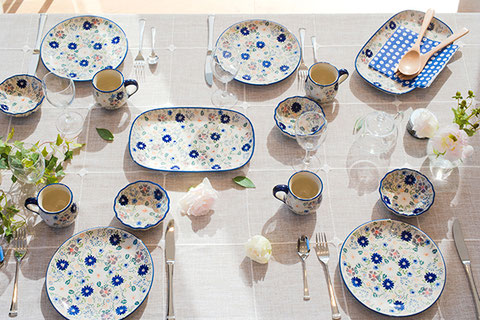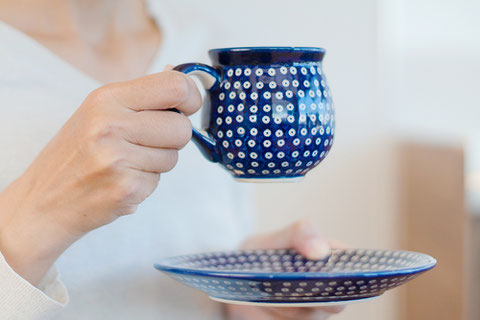 ピーコック・アイと呼ばれる、藍色のドットパターンなど伝統的な柄をベースに、新しいデザインが次々と生み出されています。世界中のポーリッシュ・ポタリーファンから愛されており、和食に合う形や柄も多いため日本でも人気が高まっています。